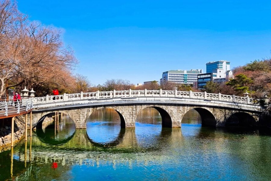 Любой большой город в Южной Корее трудно представить без буддийского храма. В парке Дурью таких церквей целых две, расположившихся на берегу Соборного пруда. Как и любой буддийский храм, они открыты для всех – как верующих и паломников, так и обычных туристов, которые готовы соблюдать некоторые ограничения из уважения к священным местам. Из окон и открытой веранды храмов открываются прекрасные виды на город, мост и окружающую растительность.